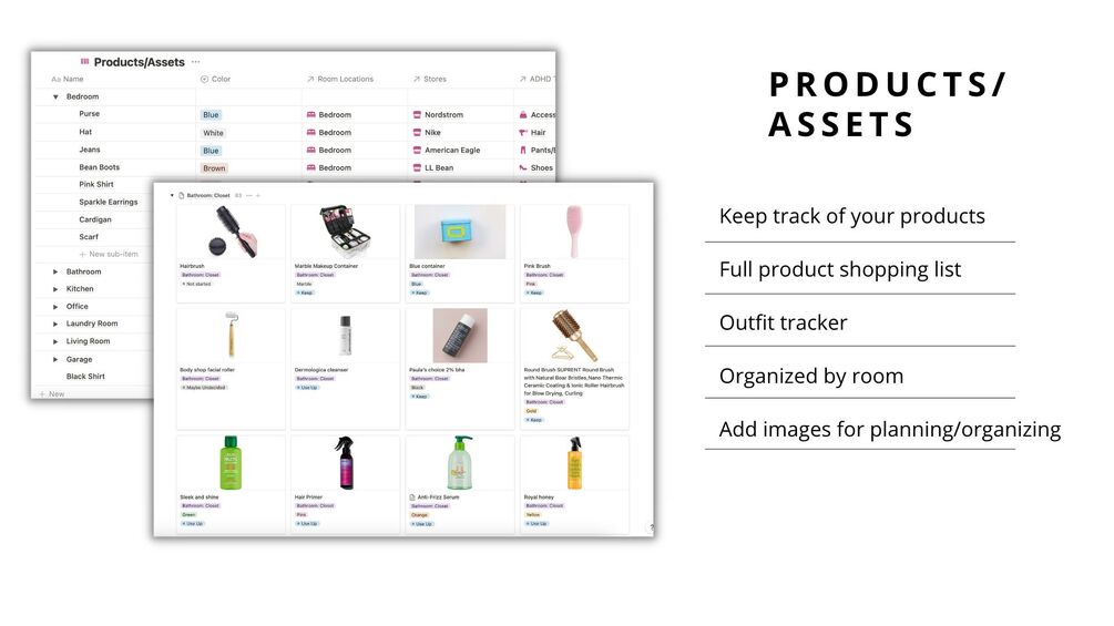 Products/Assets: This database is designed to keep track of the different products or assets you own. Users can add the name, category, purchase date, and other relevant information. This database can be helpful in keeping track of your belongings and knowing when it's time to replace or upgrade them.